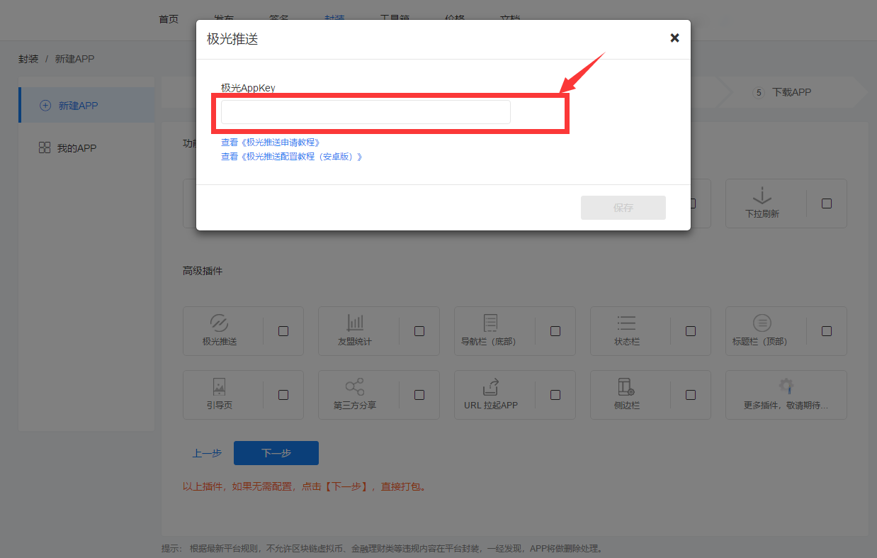 在插件配置中,选择【极光推送】,将保存好的AppKey填入其中,然后点击下一步操作,进行重新打包,即可完成。