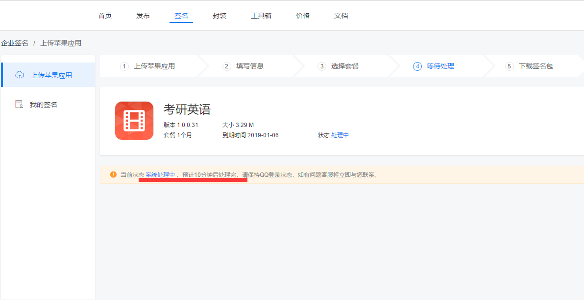 第四步、等待10分钟后,程序将自动完成签名,签名完成后,下载签名包。